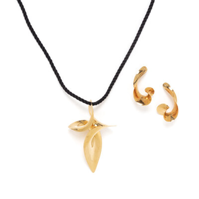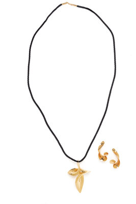 Necklace on black cord with yellow gold clasp. 18 karat yellow gold. Necklace: 31 1/4 inches long. Pendant: 2 3/4 inches long. Earrings: 1 5/8 inches long.