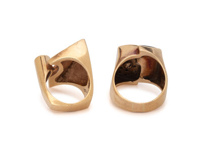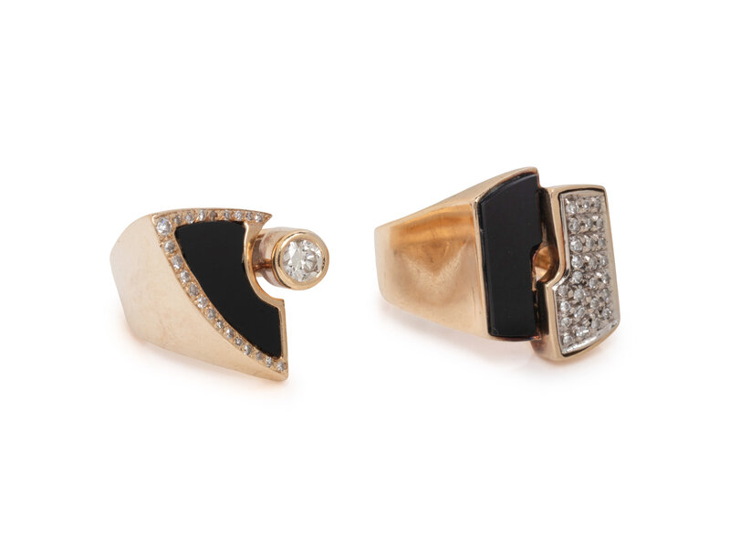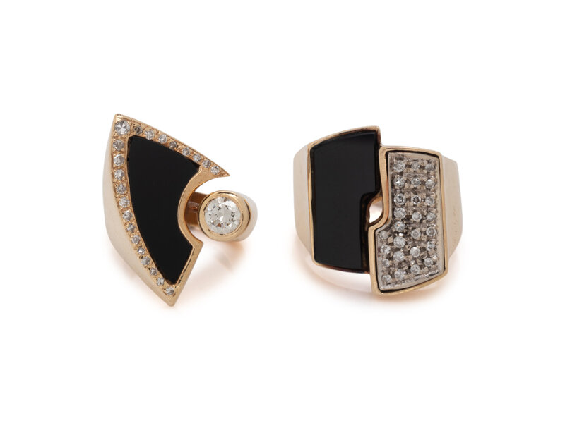 Round brilliant and single cut diamonds, and onyx. 14 karat yellow gold. Ring sizes 3 1/2 and 7.