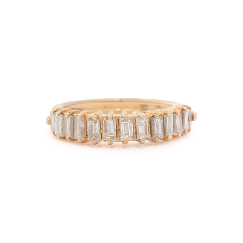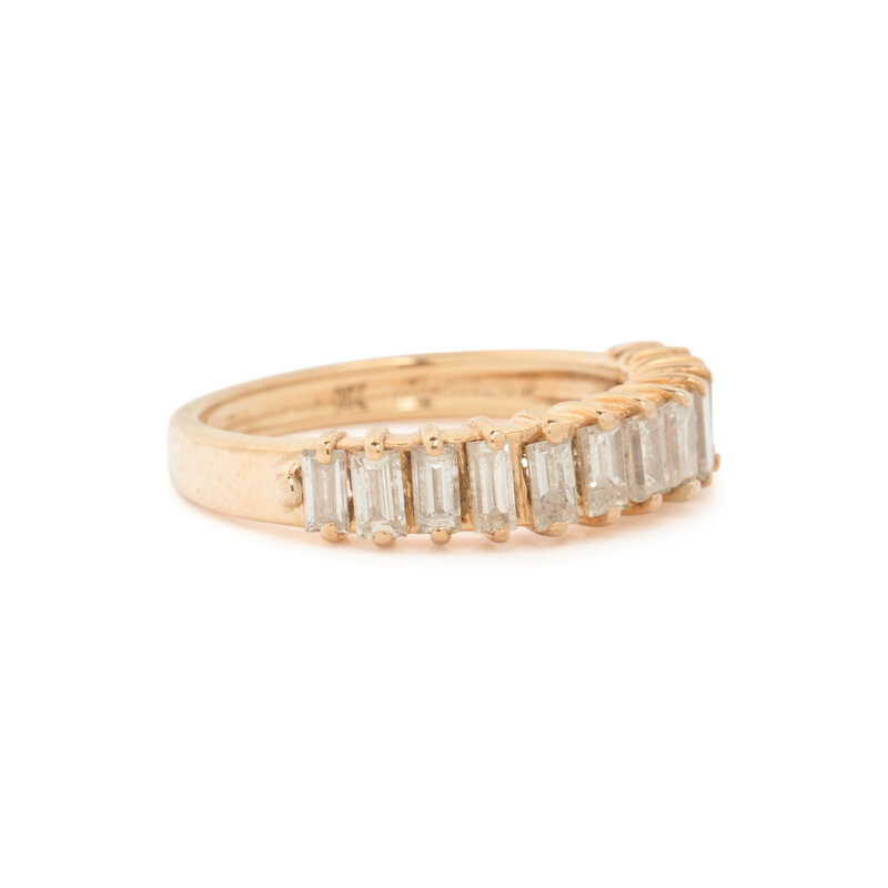 Emerald cut diamonds weighing approximately 1.30 carats total. 18 karat yellow gold. Ring size 6 1/2.