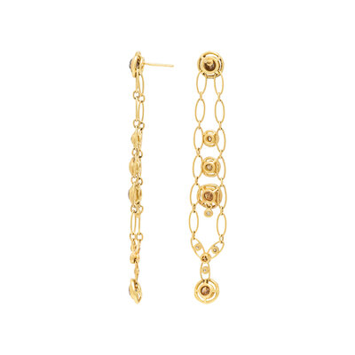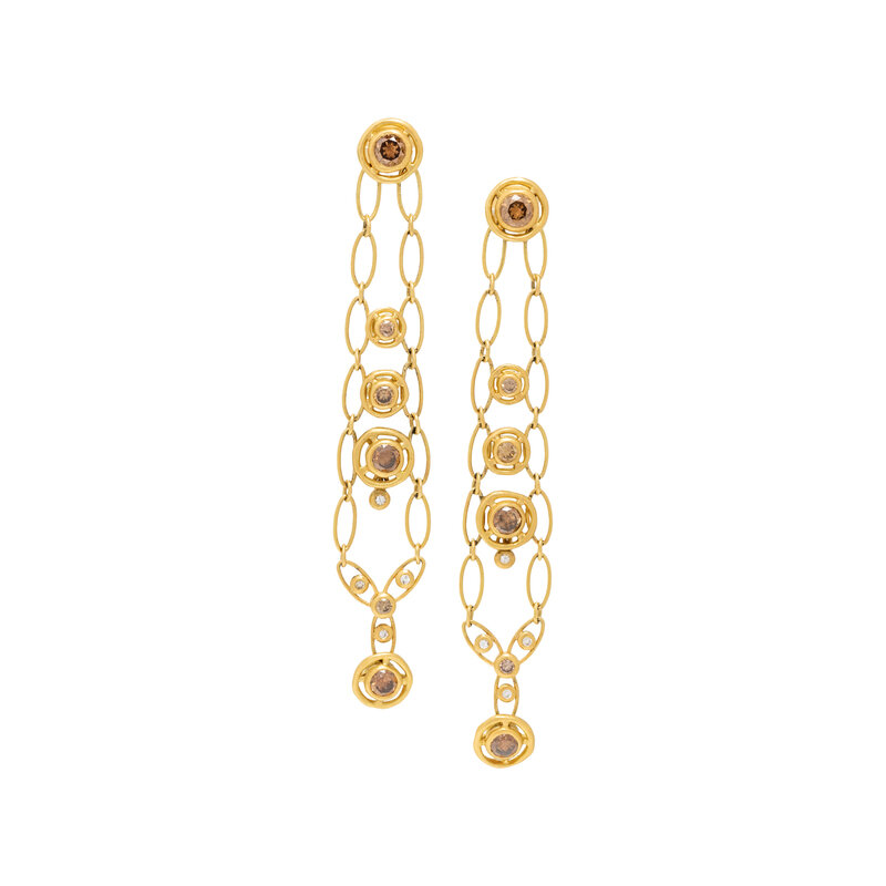 Round brilliant cut brown diamonds (origin of color not tested) weighing approximately 1.97 carats total and round brilliant cut diamonds weighing approximately 0.10 carat total. 18 karat yellow gold. 3 inches long.