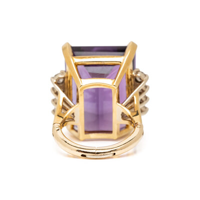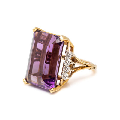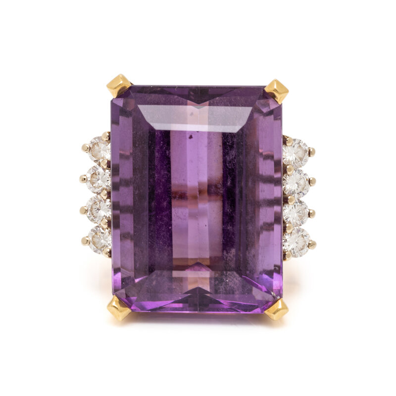 Emerald cut amethyst measuring approximately 21.35 x 16.10 x 11.90 mm and round brilliant cut diamonds. Yellow gold. Ring size 4.