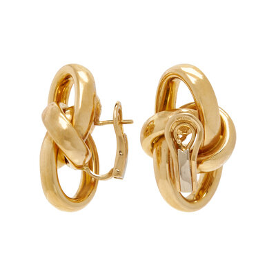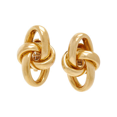 In an open knot design, posts with clipbacks. 18 karat yellow gold. 1 1/4 inches long.