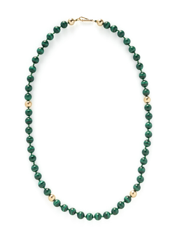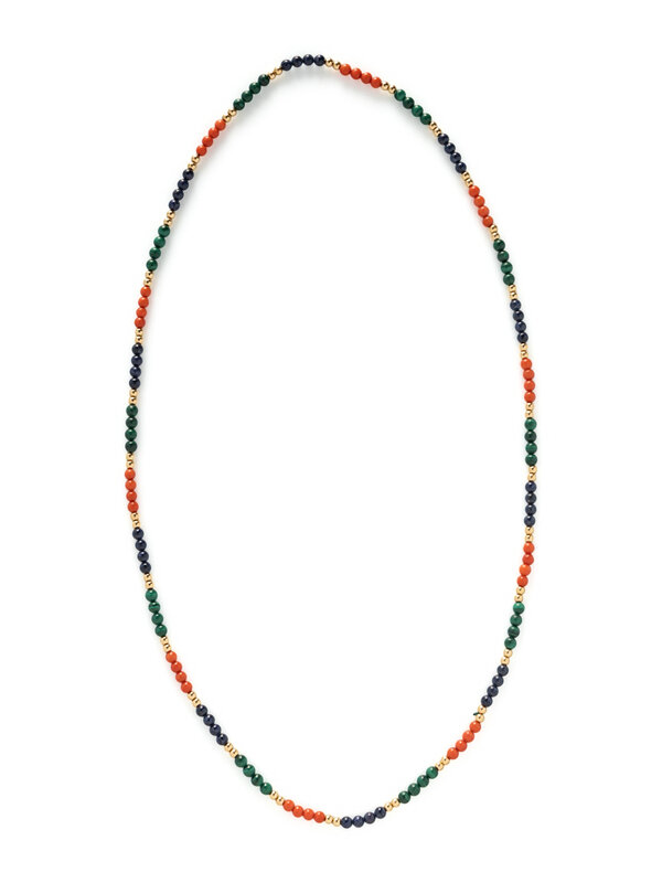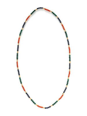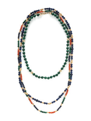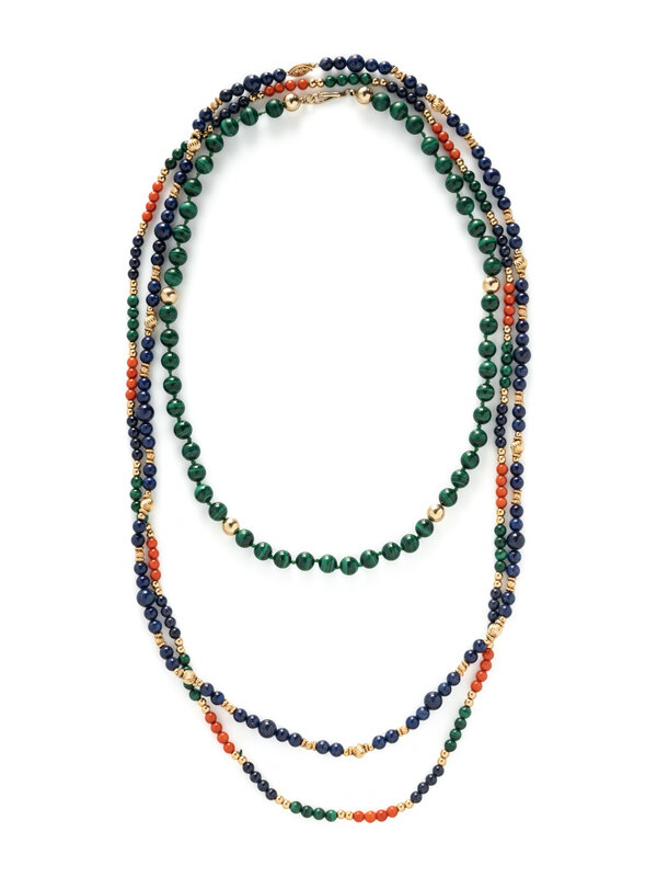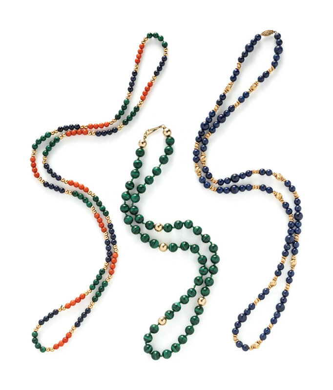 One strung with malachite beads, one with lapis lazuli, and one with coral, lapis lazuli, and malachite. Yellow gold. 22 1/2 inches, 30 1/2 inches, and 31 1/2 inches long.