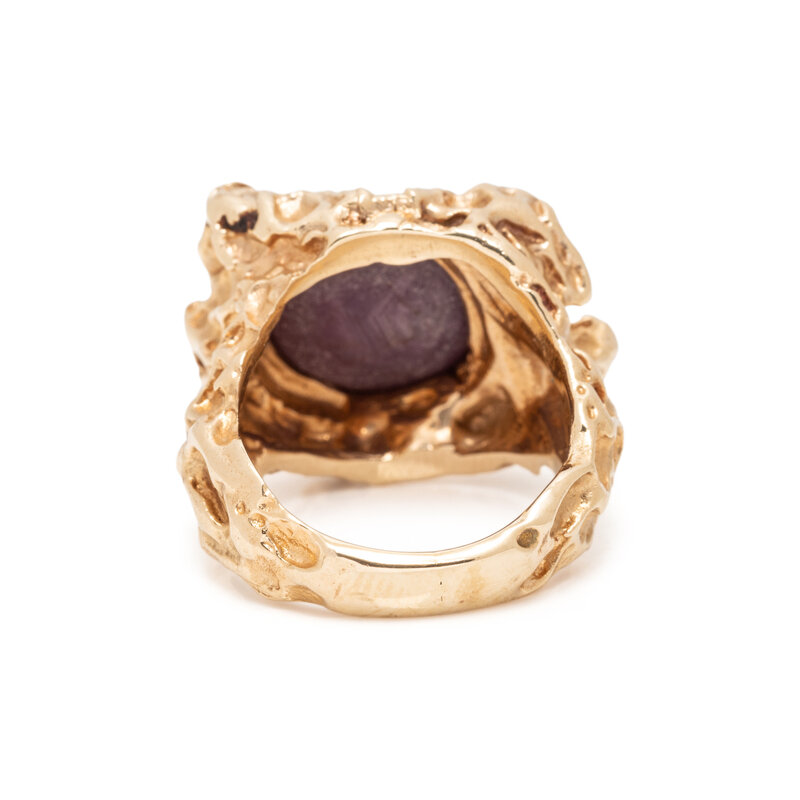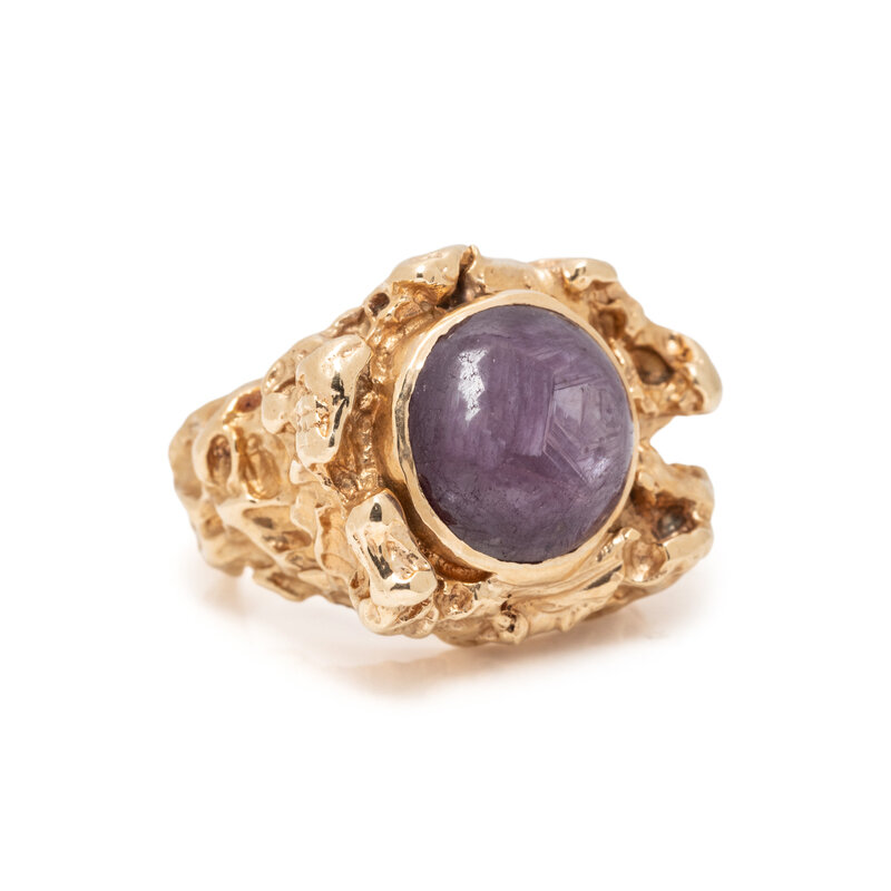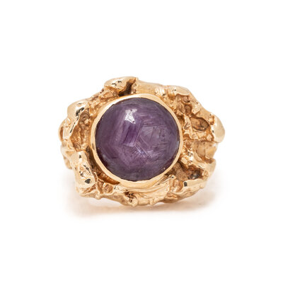 Containing one round cabochon star ruby measuring approximately 11.00 x 11.30 x 6.30 mm in a yellow gold nugget-style mounting. Ring size 5 1/4.