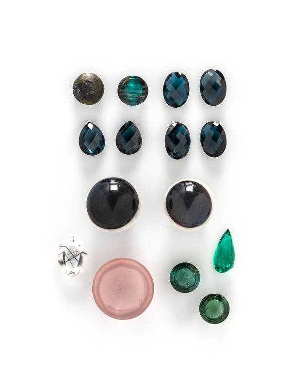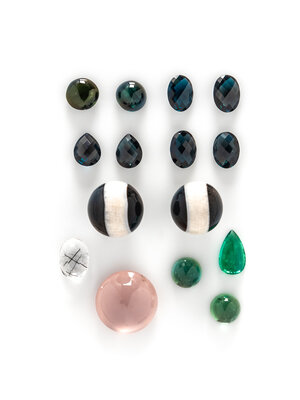 Consisting of four oval checkerboard faceted tourmaline, two pear shape checkerboard faceted tourmaline, one round cabochon star rose quartz, one oval cabochon tourmalinated quartz, one pear shaped synthetic emerald, two round cabochon blue/green tourmaline, two round cabochon cat's eye gemstones, and two agate spheres.