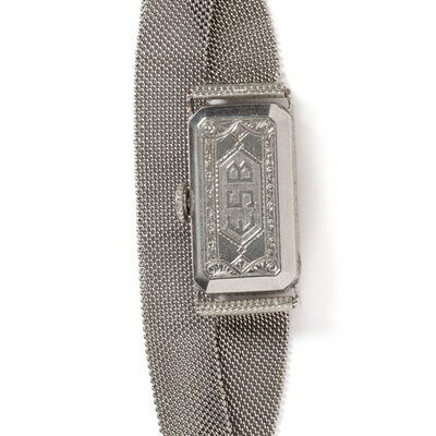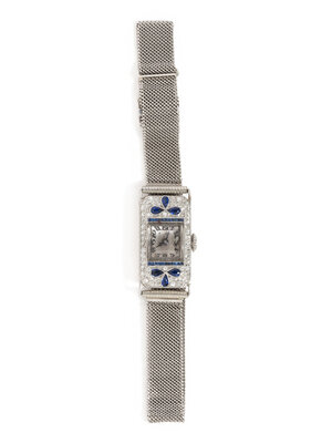 24.00 x 13.00 mm platinum case set with single cut diamonds, pear shaped and square step cut sapphires, silvered dial, manual wind movement and mesh link white gold bracelet. 5 3/4-8 1/2 inches inner circumference.