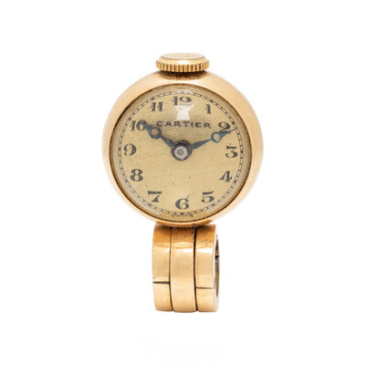 Consisting of a 20.00 mm case with yellow dial and manual wind movement. 14 karat yellow gold. 1 1/4 inches long.