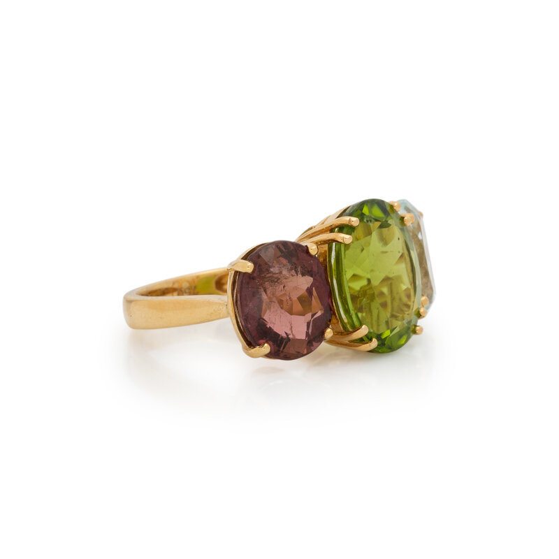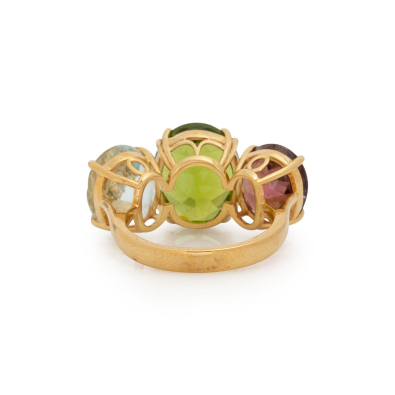 Oval faceted peridot, aquamarine, and pink tourmaline. 18 karat yellow gold. Ring size 6 1/2.