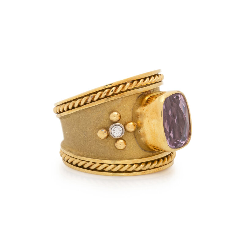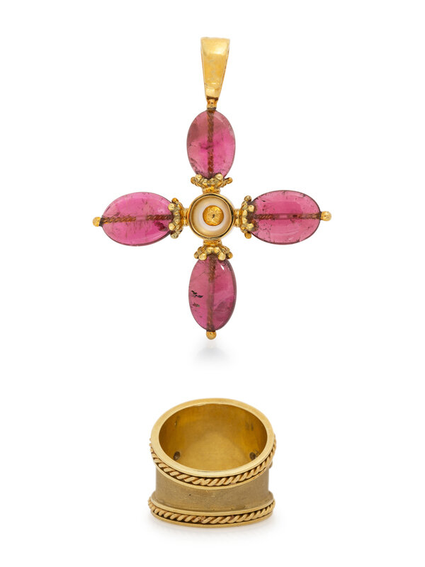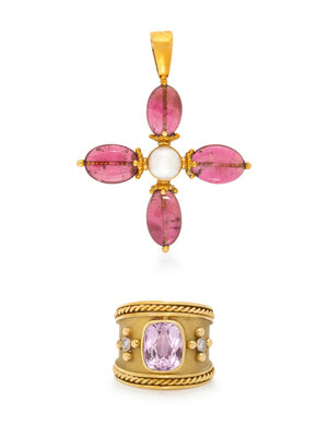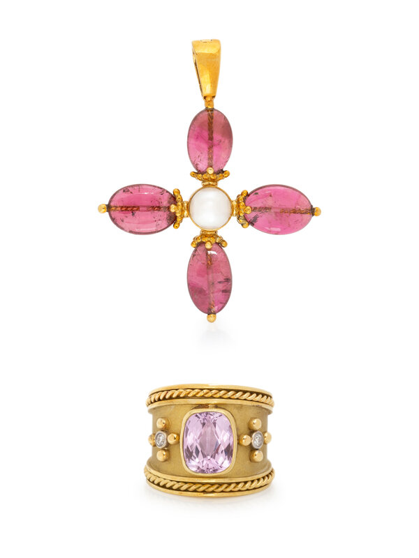 Including a ring set with a cushion faceted kunzite measuring approximately 10.00 x 8.05 mm and round brilliant cut diamonds, and a pendant set with pink tourmaline beads and a cultured pearl measuring approximately 10.00 mm. 18 karat yellow gold. Ring size: 7 1/2. Pendant: 2 5/8 x 2 inches.