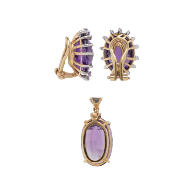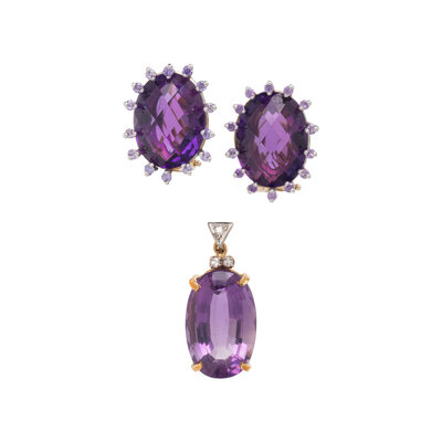 Including a pair of clip earrings set with oval checkerboard faceted amethyst and round faceted light purple stones, and a pendant sent with oval faceted amethyst and single cut diamond accents. 18 karat yellow and white gold. Earrings: 3/4 inches long. Pendant: 1 inch long.