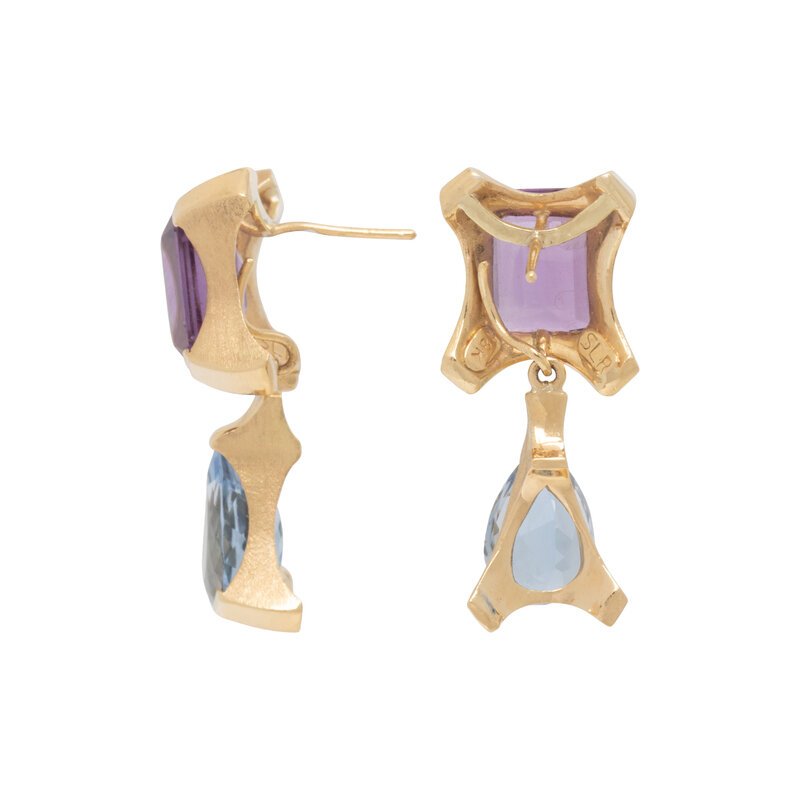 Stud earrings containing emerald cut amethyst measuring approximately 10.15 x 8.20 x 4.70 mm, with removable drops set with pear shape aquamarine measuring approximately 12.15 x 7.25 x 5.50 mm. 18 karat yellow gold. 1 1/8 inches long.