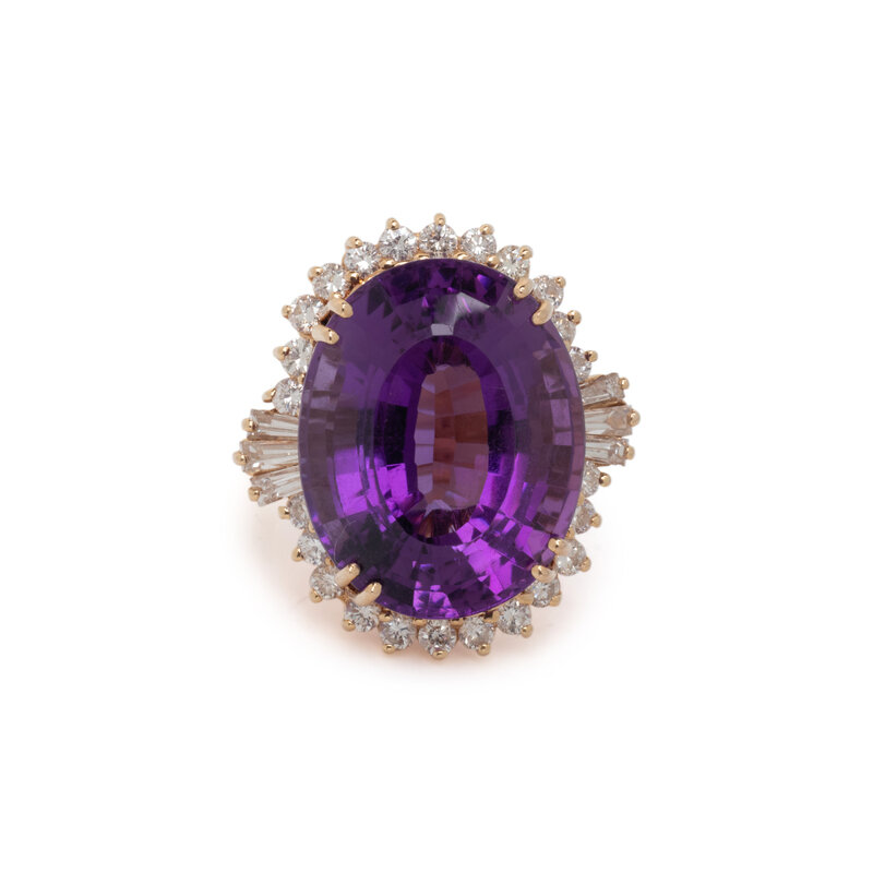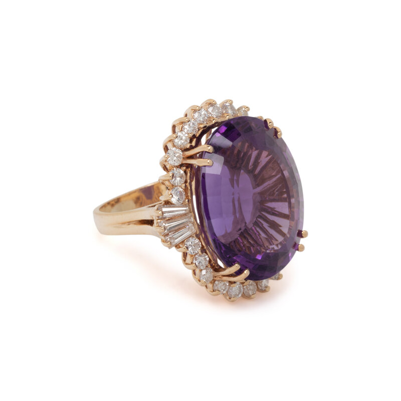 Oval step cut amethyst measuring approximately 20.60 x 16.50 x 12.00 mm, tapered baguette and round brilliant cut diamonds. 14 karat yellow gold. Ring size 6 1/4.