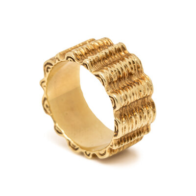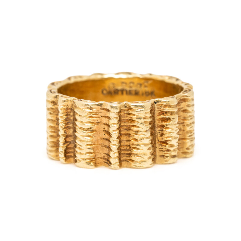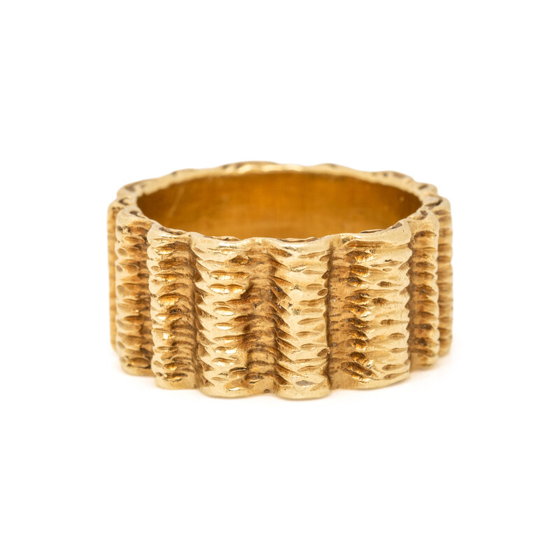 Textured 18 karat yellow gold. Ring size 3 3/4.