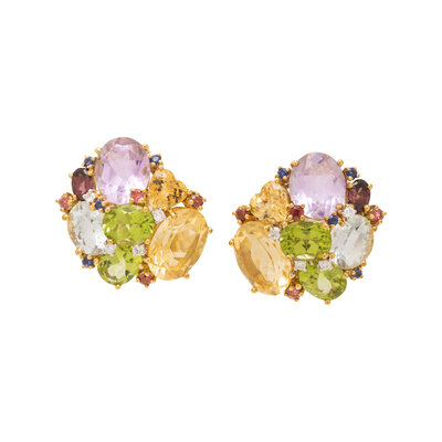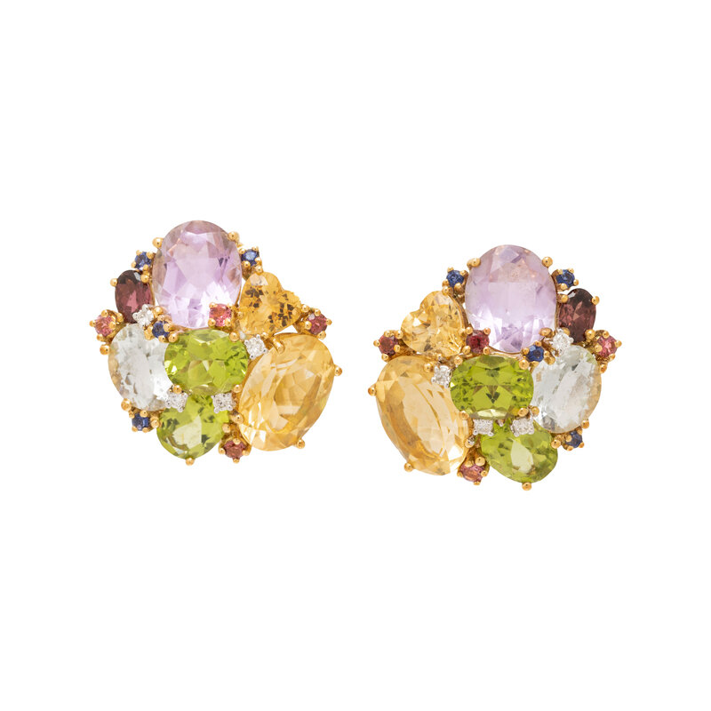 Variously shaped gemstones including amethyst, citrine, garnet, pink tourmaline and peridot and round brilliant cut diamonds, folding posts with clip backs. 18 karat yellow gold. 1 inch long.