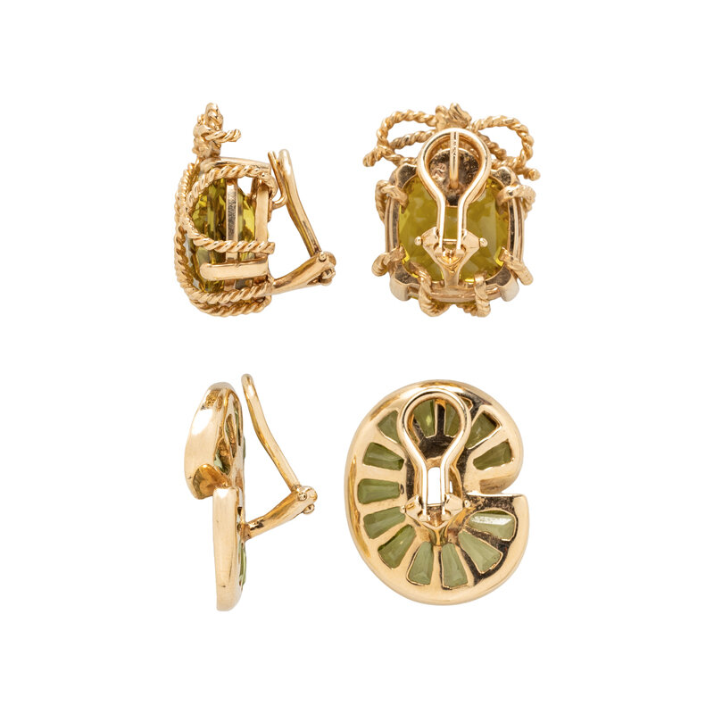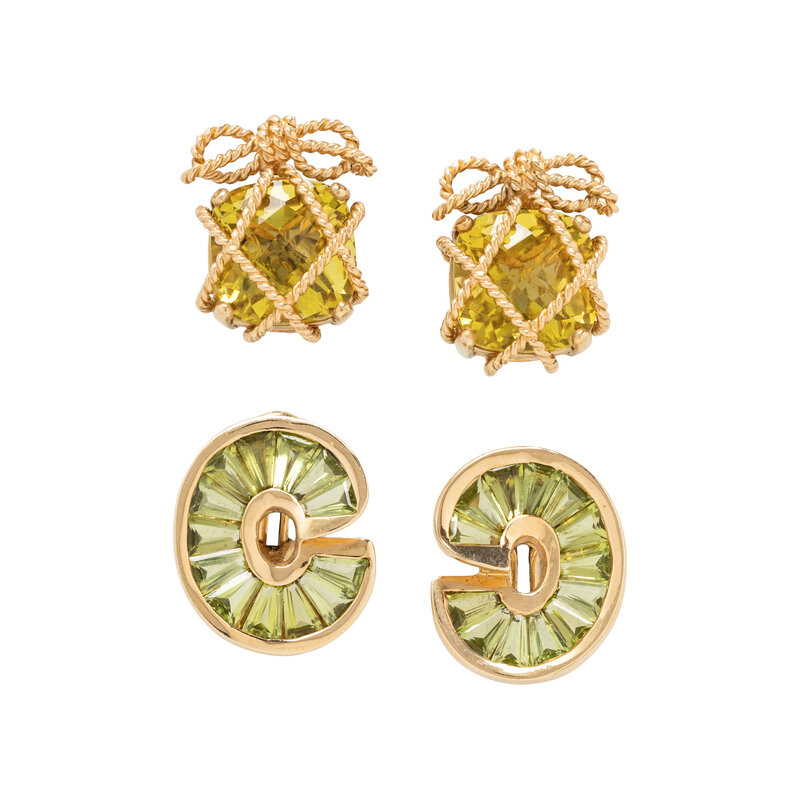 Consisting of a pair set with cushion checkerboard cut yellowish green gemstone, together with a pair set with calibre cut peridot. 14 karat yellow gold. 7/8 inch and 1 inch long.