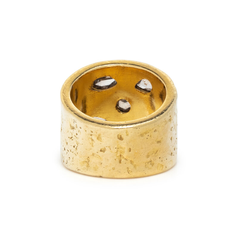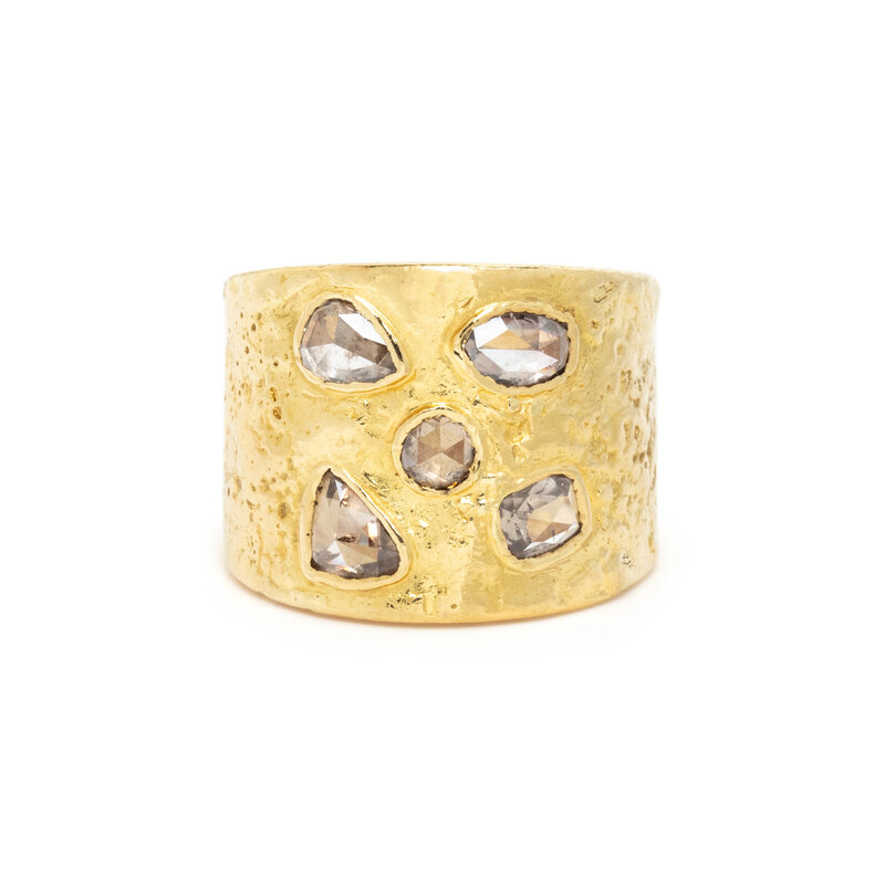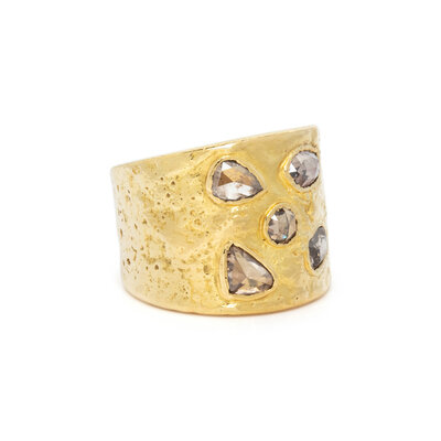 Variously shaped rose cut brown diamonds. Yellow gold. Ring size 6 1/2, 18.00 mm wide.