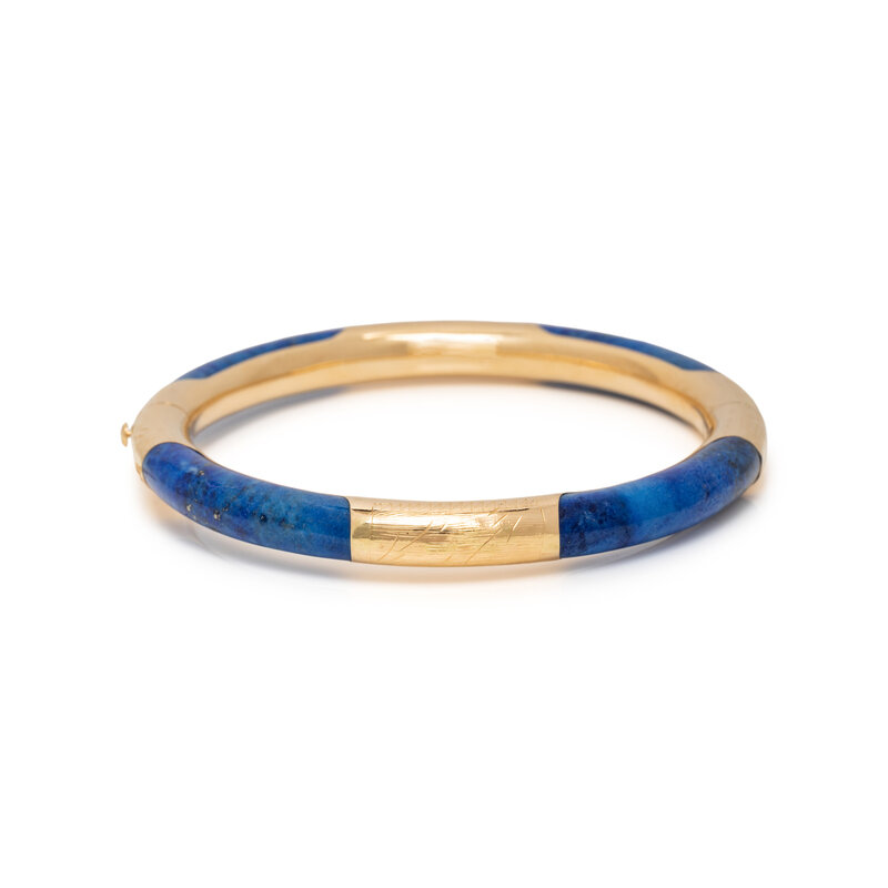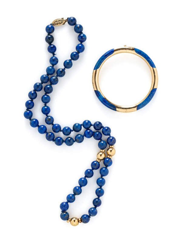Including a necklace of lapis lazuli beads measuring approximately 9.85 mm, and a bangle bracelet set with lapis lazuli inlay, hinged with side clasp. Yellow gold. Necklace: 25 1/4 inches long. Bracelet: 7 inches inner circumference.