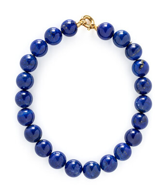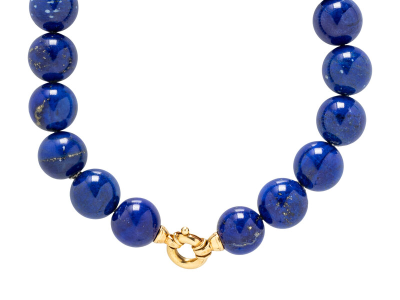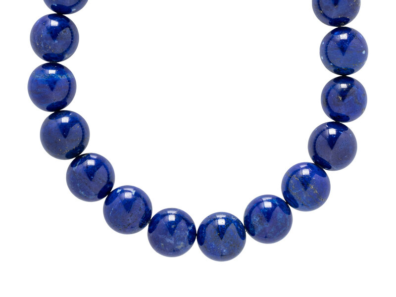 Lapis lazuli beads measuring approximately 17.50 - 18.00 mm. 18 karat yellow gold. 16 1/4 inches long.