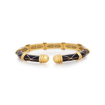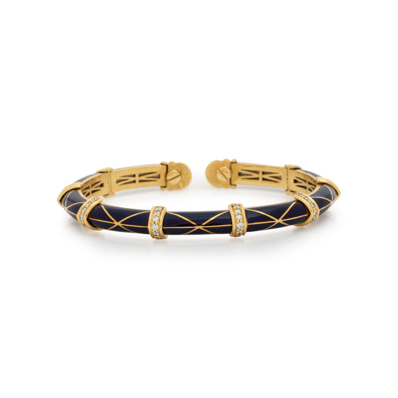 SUSY MOR, YELLOW GOLD, ENAMEL, AND DIAMOND BANGLE BRACELET