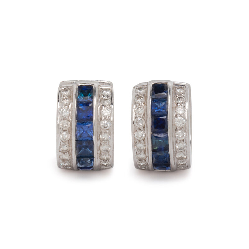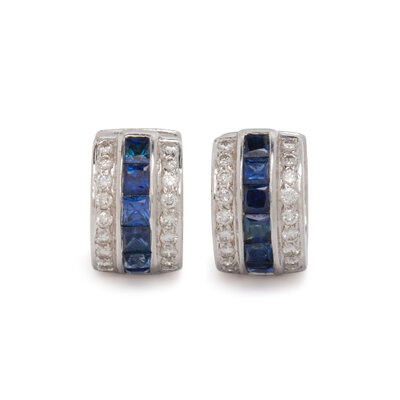 French cut sapphires and round brilliant cut diamonds weighing approximately 0.35 carat total. 18 karat white gold. 1/2 inch long.