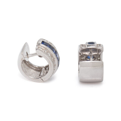 WHITE GOLD, DIAMOND, AND SAPPHIRE HUGGIE HOOP EARRINGS
