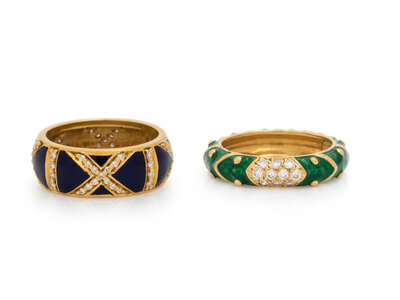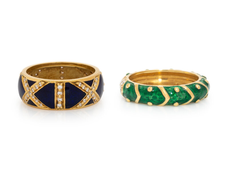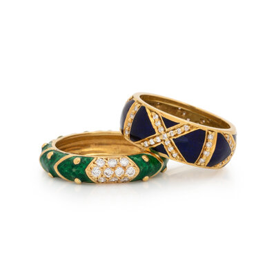 Round brilliant cut diamonds, blue and green enamel. 18 karat yellow gold. Ring sizes 6 1/4 and 7.