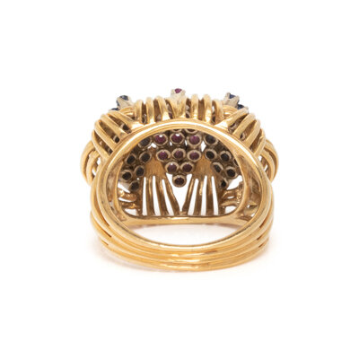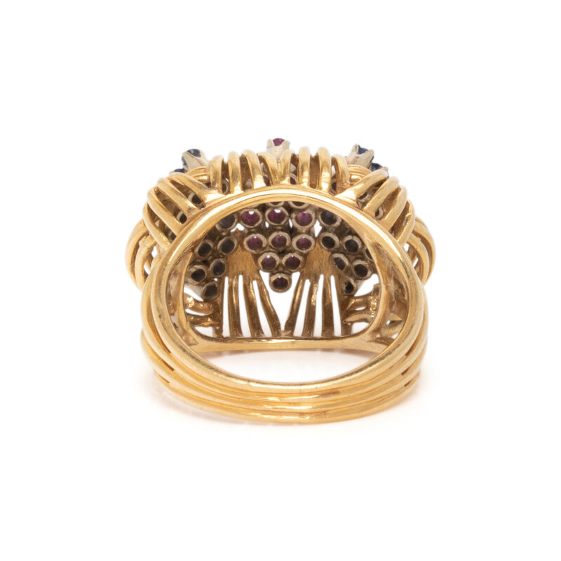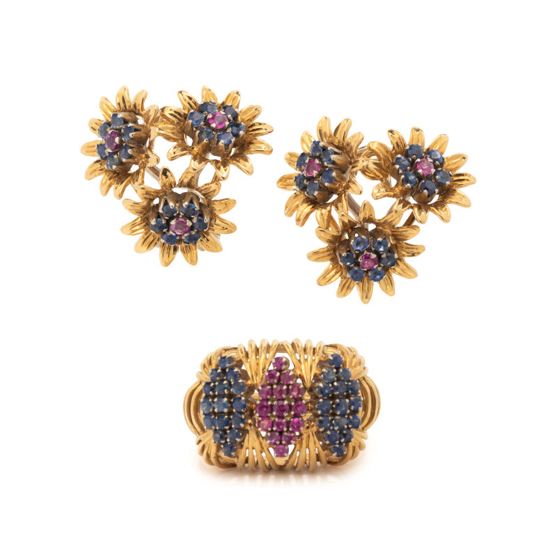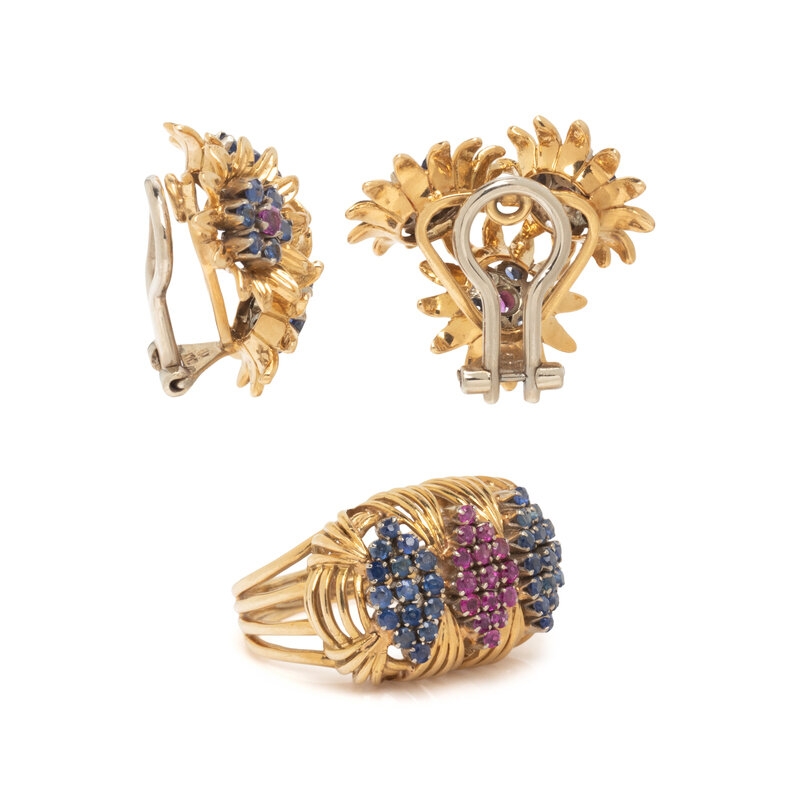 Consisting of a ring and earclips, set with round faceted rubies and sapphires. 18 karat yellow gold. Earclips: 3/4 inch long. Ring size: 6.