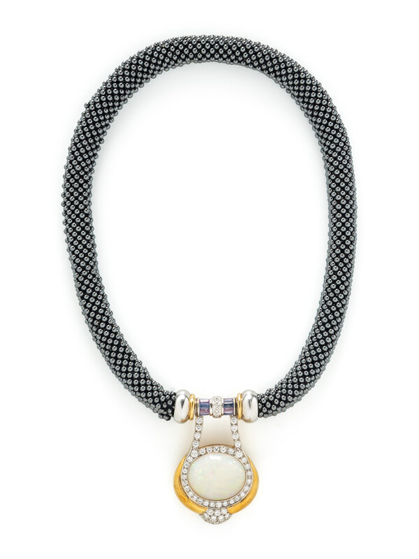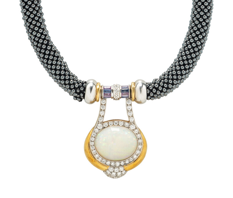 Focal set with an oval cabochon opal measuring approximately 21.80 x 17.60 x 6.55 mm, baguette cut blue and pink sapphires, and round brilliant cut diamonds weighing approximately 1.80 carats total. 18 karat yellow and white gold and hematite. 15 1/2 inches long.