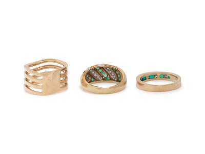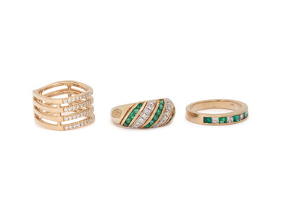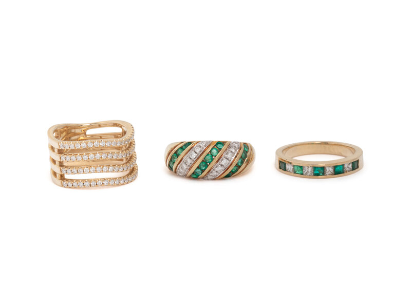 Consisting of a yellow gold ring containing round brilliant cut diamonds, a yellow gold ring containing square step cut emeralds and princess cut diamonds, and a yellow and white gold ring containing round brilliant cut diamonds and round faceted emeralds. Ring sizes 6 1/4, 6 3/4, and 6 3/4.