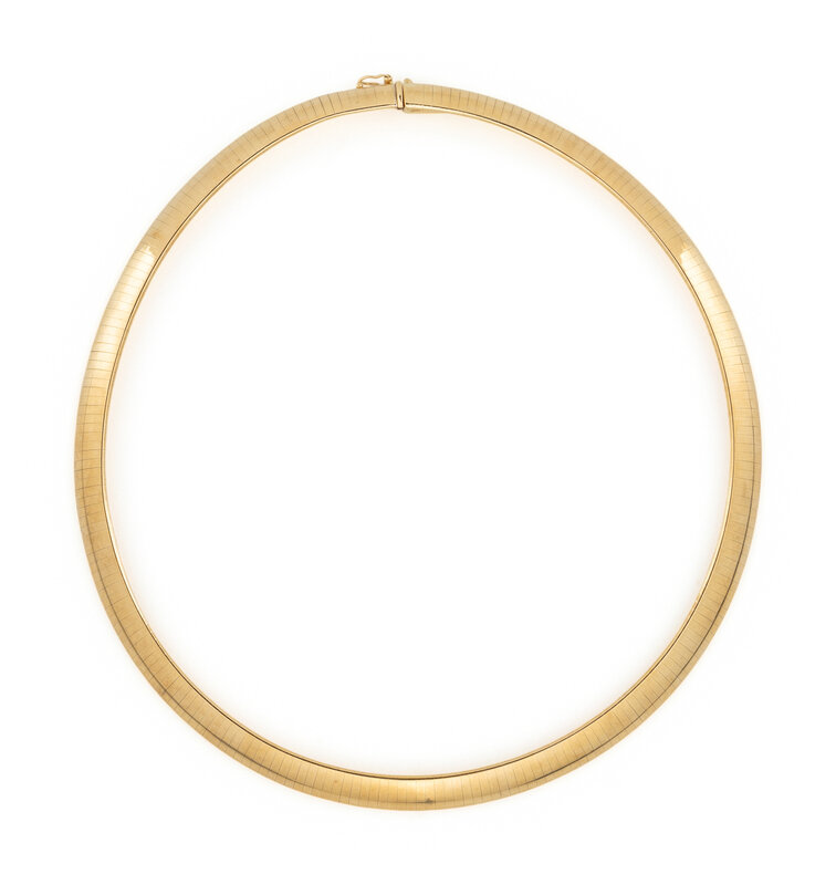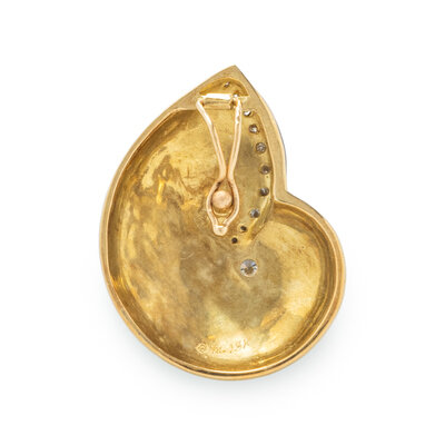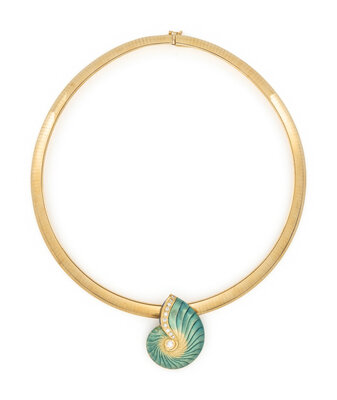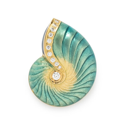 Shell-form pendant set with green and blue enamel and round brilliant cut diamonds. 18 karat yellow gold. Necklace: 16 inches long. Pendant: 1 1/2 inches long.