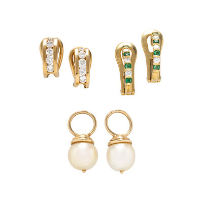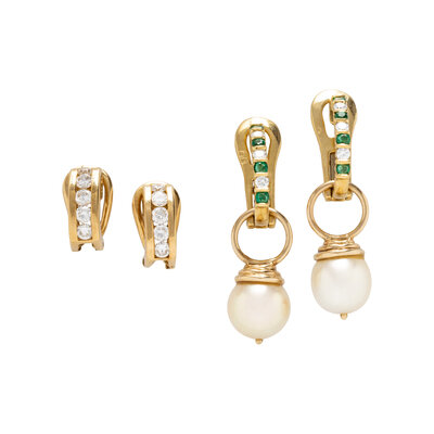 Two pairs of clip earrings, one set with round brilliant cut diamonds, the other set with round faceted emeralds and round brilliant cut diamonds, and a pair of detachable drops set with cultured pearls measuring approximately 8.45 - 8.75 mm. Yellow gold. 9/16 inch long, 7/16 inch long, and 3/4 inch long.