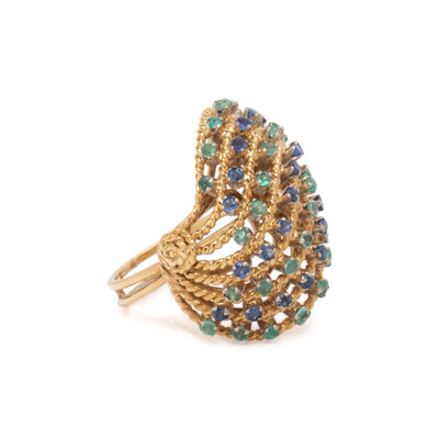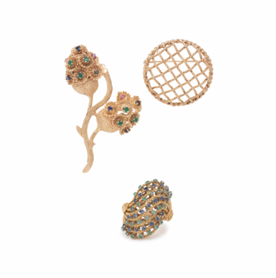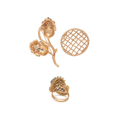Including a wire twist brooch, a floral brooch set with round faceted rubies, sapphires, and chrysoprase, and a ring set with round faceted emeralds and sapphires. Yellow gold. Brooches: 1 1/4 inches wide and 2 1/4 x 1 1/2 inches. Ring size: 6.