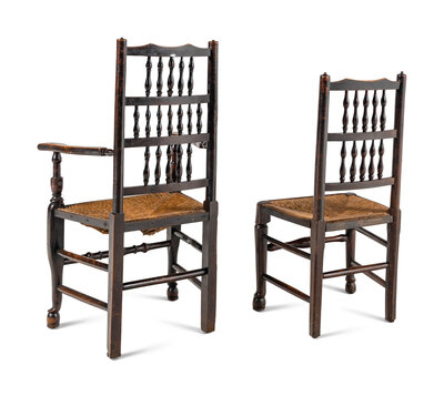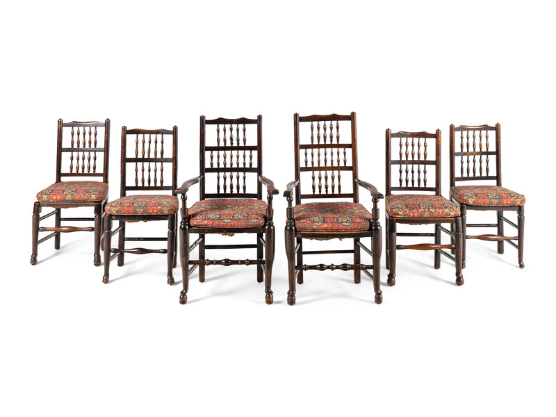 Height of armchairs 43 1/2 x width 24 x depth 20 inches; height of side chairs 38 1/2 x width 19 x depth 15 3/4 inches.
