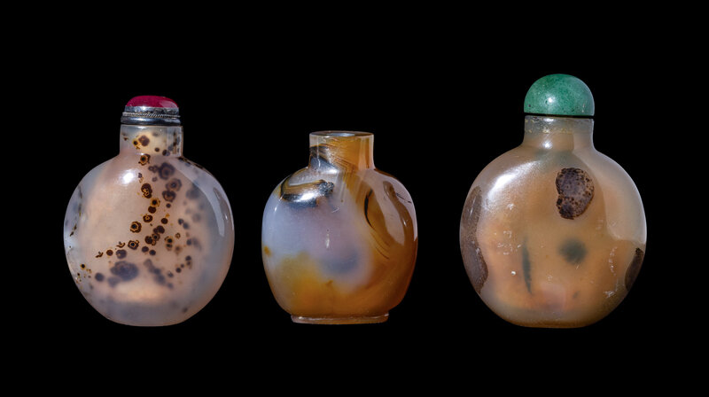 comprising two examples of compressed rounded form, the smaller fitted with a metal-mounted red glass stopper, the larger with a green glass stopper; and one bottle of rounded rectangular form with a straight foot.
