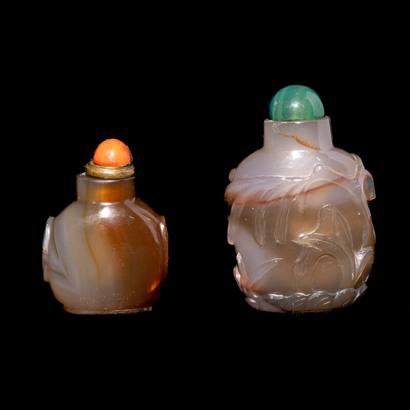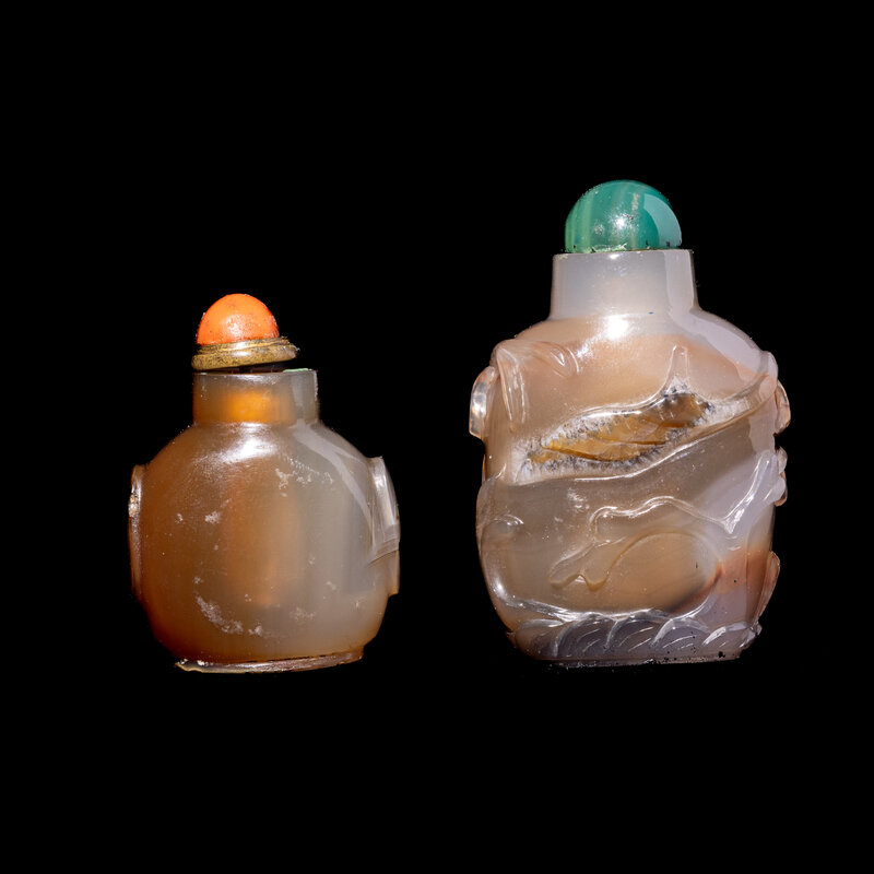 the first a rounded example carved with a pair of oval handles, the second carved to the exterior in relief with trees and branches.
