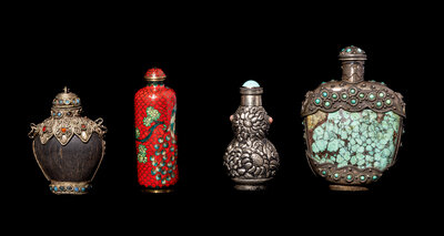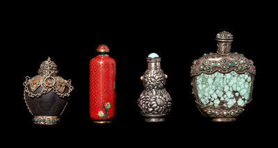 comprising a cloisonne enamel cylindrical example, a silvered metal gourd-form example, a Mongolian silver mounted horn example and a Mongolian hardstone inset silver mounted turquoise example.