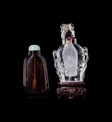 the first a smoky quartz example with plain sides, the second a carved rock crystal example in the form of a miniature flower vase, raised on a hardwood stand.