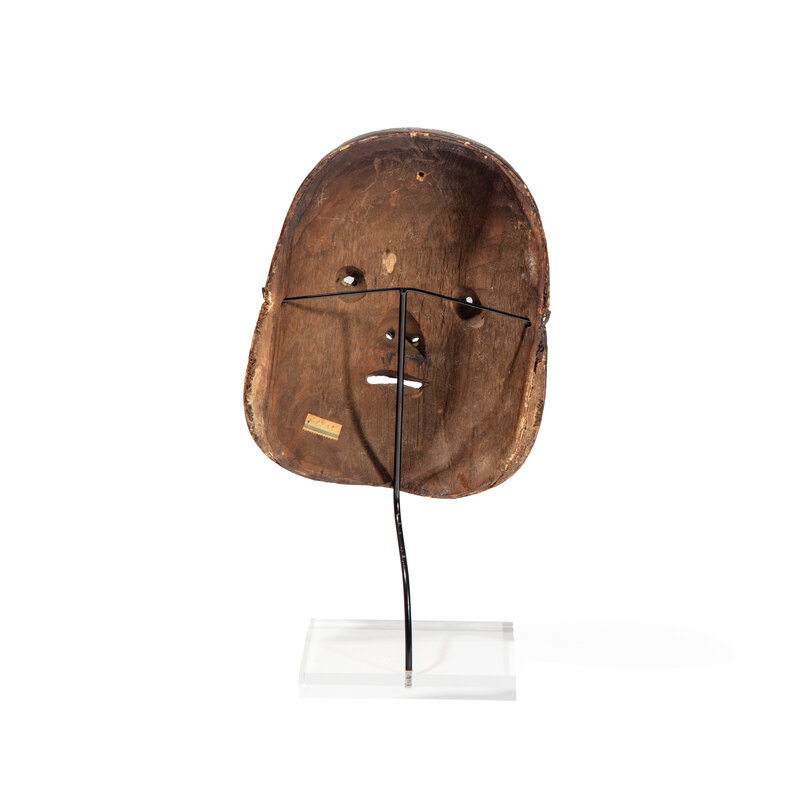 The mask carved from wood and painted, modern metal stand.