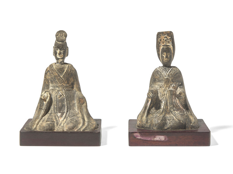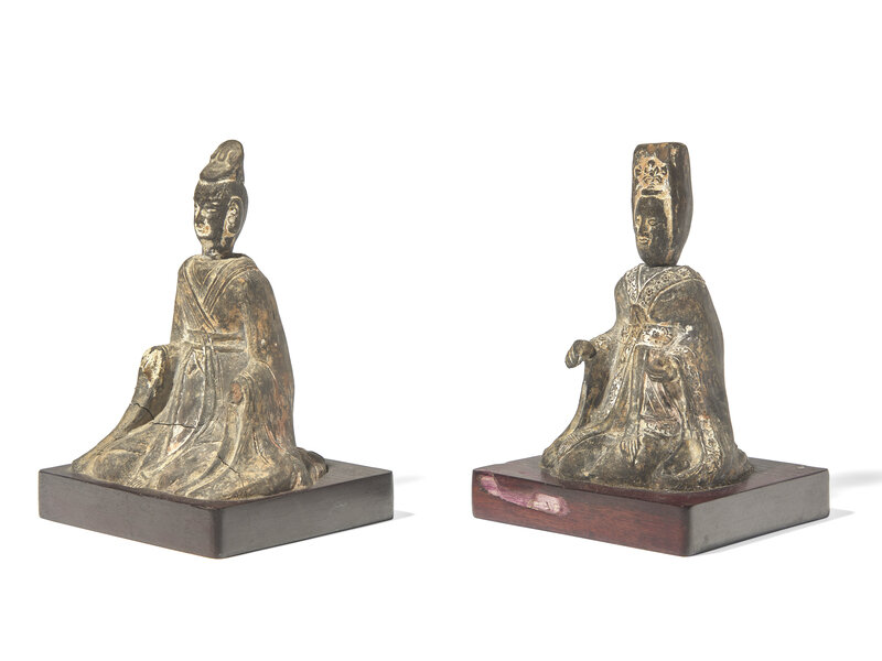 Seated in heavy flowing robes, belt to front and long pleats to the rear, separately formed head, traces of pigment, later wood stands.