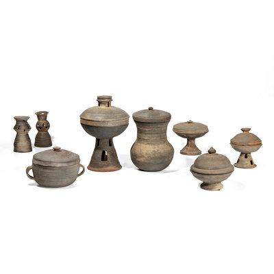 Comprised six vessels with associated covers, and a pair of pottery cup with rattle stems.
