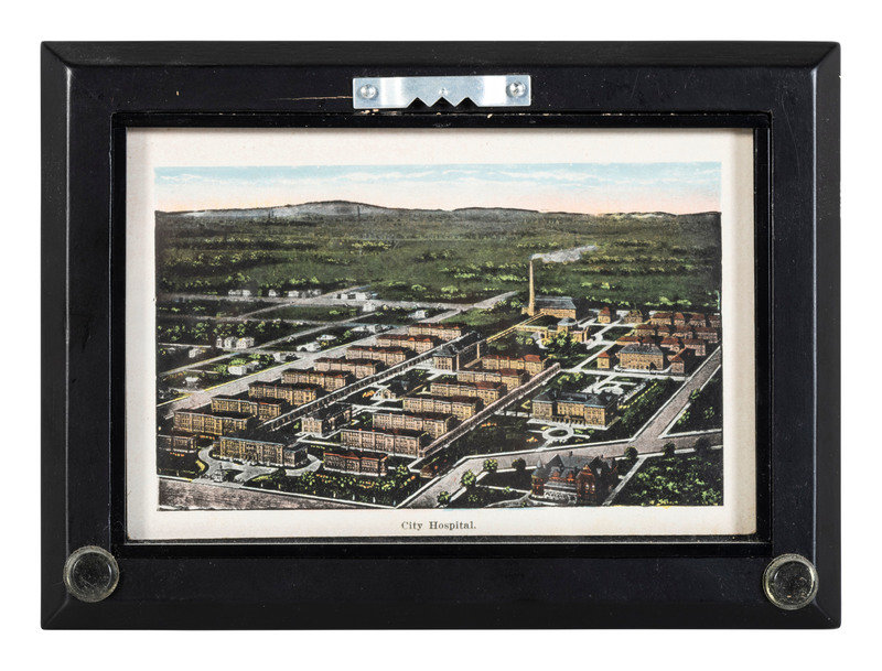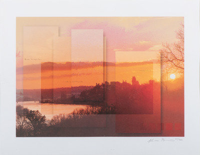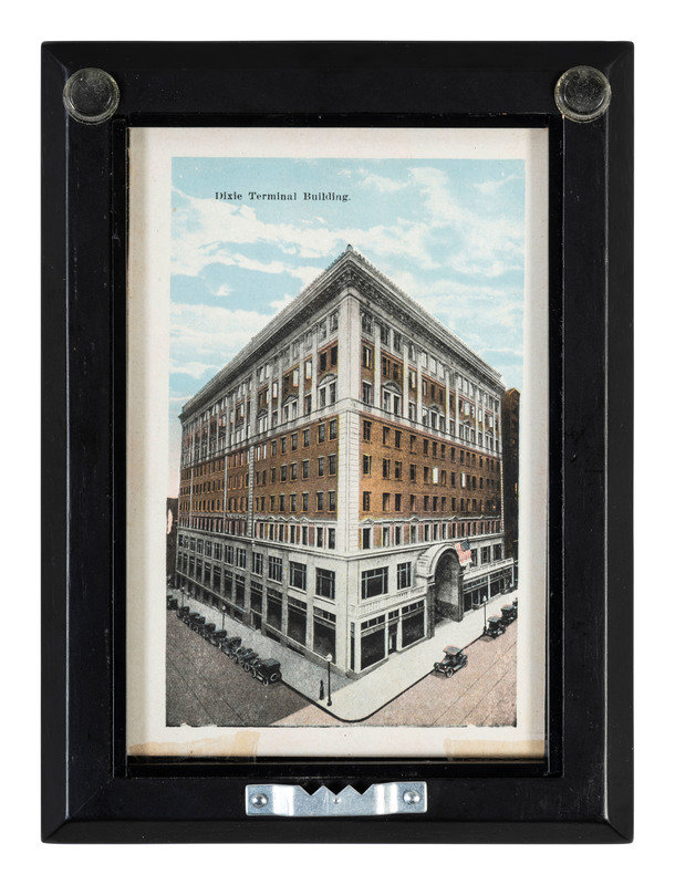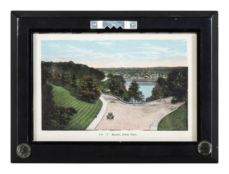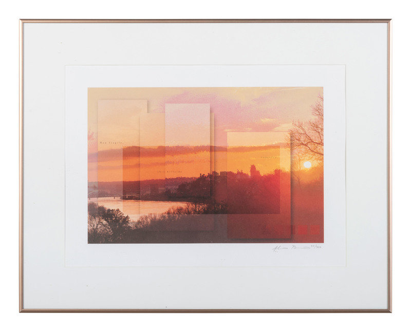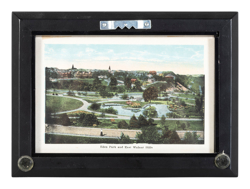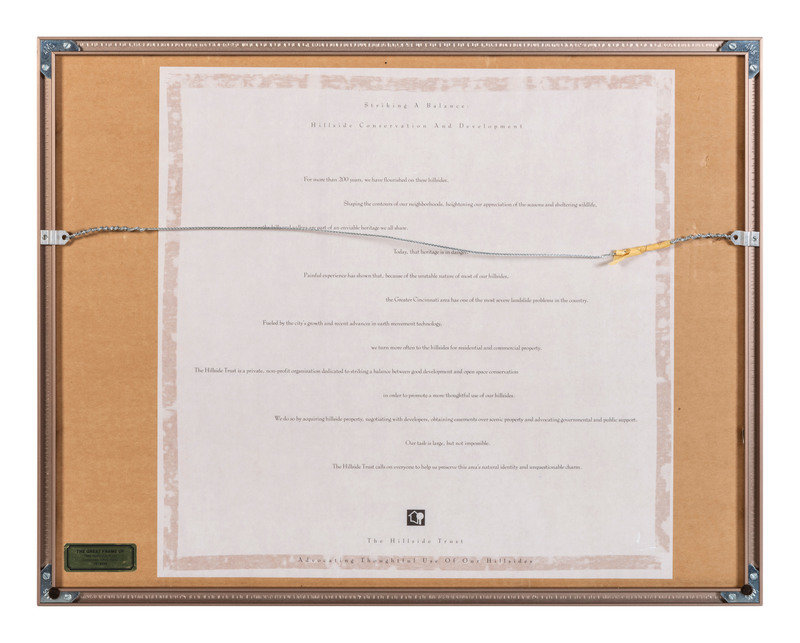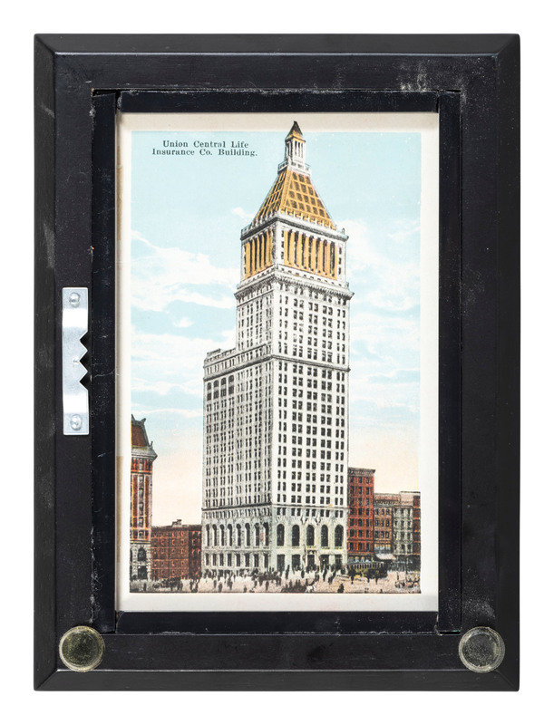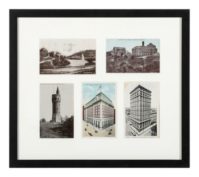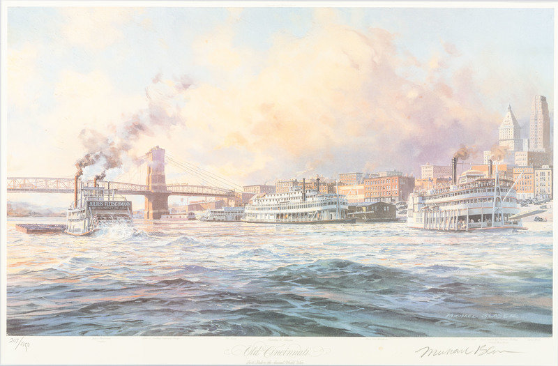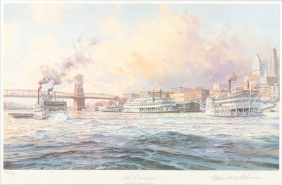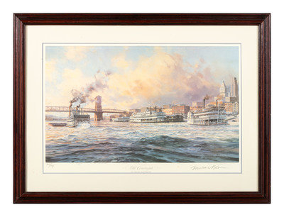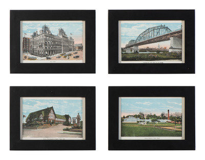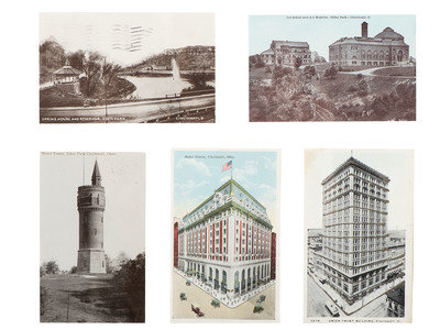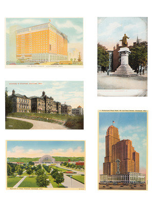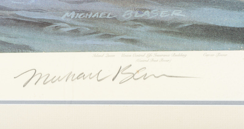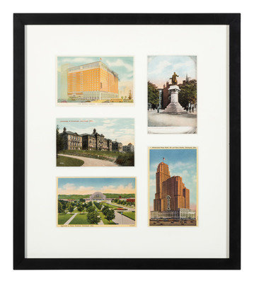 comprising 10 color postcards of landmarks, housed in 2 frames; 8 double-sided postcards framed individually; two copies of Mendenhall views of Cincinnati; a print titled Old Cincinnati by Michael Blaser (American, born 1947) of the Cincinnati skyline, signed and numbered 207/950, lower right; and a contemporary print of Cincinnati, signed illegibly and numbered 35/300.
