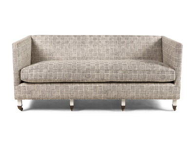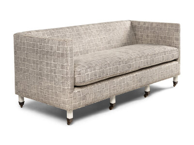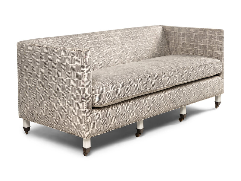 with China Seas Textura upholstery, raised on white painted legs with casters.