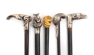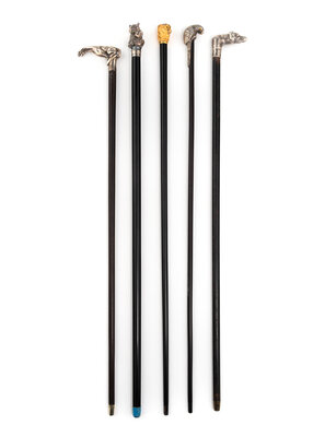 A Group of Five Silver Mounted Zoomorphic Form Walking Sticks