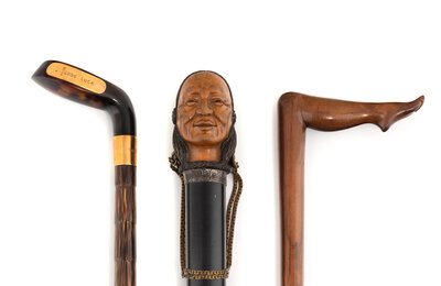 A Group of Three Carved Wood and Tortoise Shell Walking Sticks