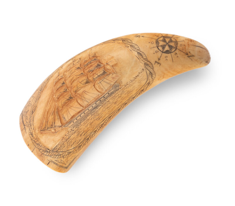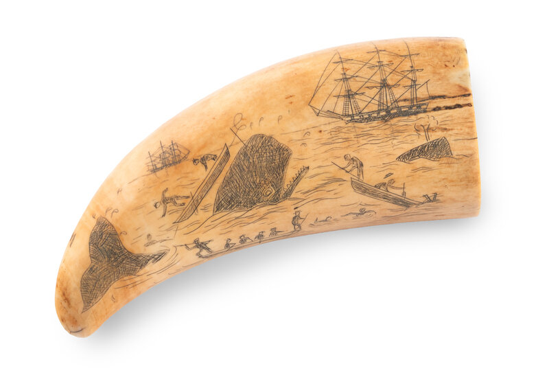 a scrimshaw-decorated and carved whale's tooth with a carved and incised whaler within a rope border; the reverse with a busy whaling scene. Object: 1 1/2 x 5 1/2 x 2 1/4 in.
