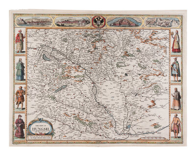 A decorative map showing Hungary and part of modern Slovakia, from the Prospect of the Most Famous Parts of the World, produced in collaboration with Speed to accompany the Theatre and published in a joint edition by George Humble in 1631.