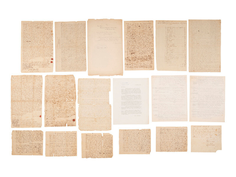 Group of approximately 20 documents, spanning ca 1700s - early 1800s (bulk second half 18th-century), including one or multiple of the following: receipts, land indentures, cash/accounting lists, last will & testaments, and more. Many documents associated with the area in and around Marshfield, Duxbury, Hingham, and Plymouth, Massachusetts, and with the dealings of families such as the Ameses, Winslows, Kents, Bradfords, Carvers, and Thomases.