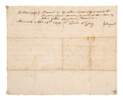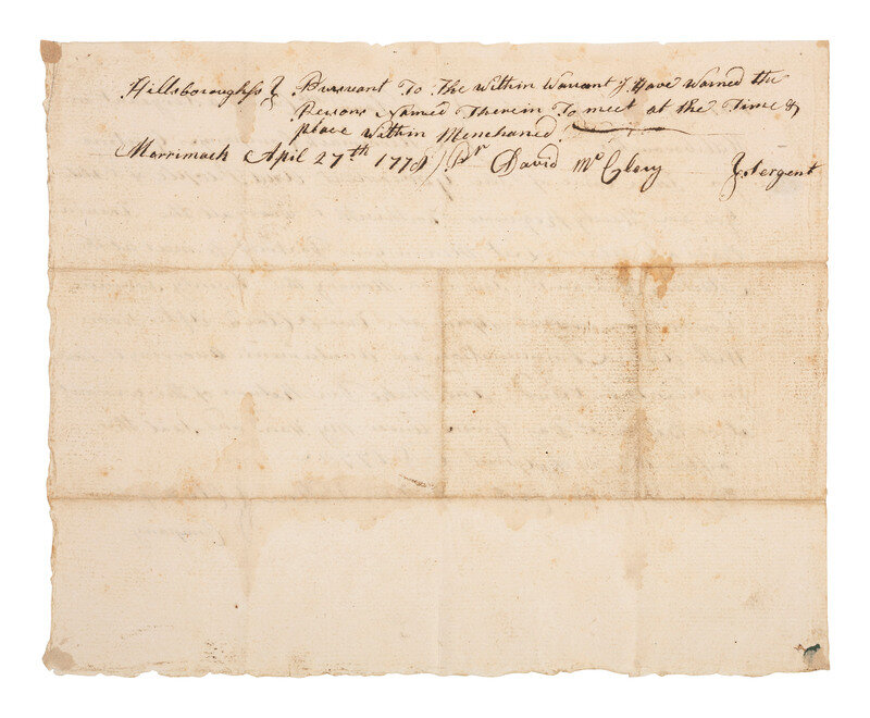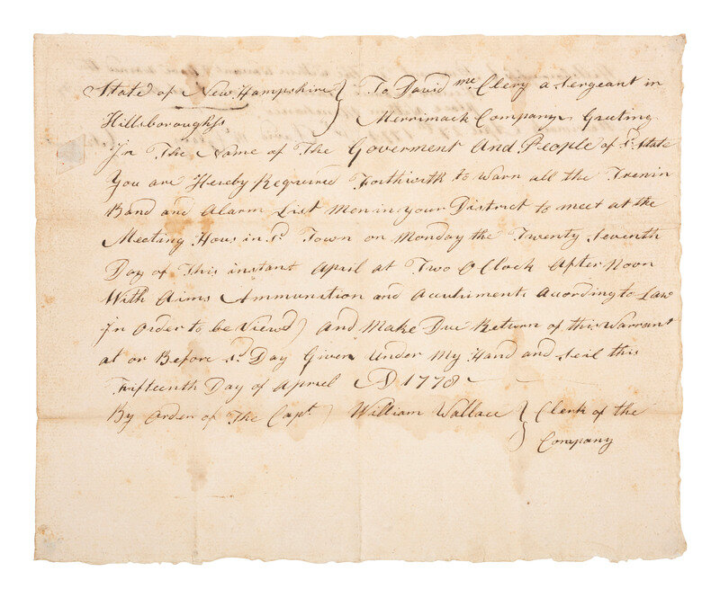 Warrant "To David McClery a Sergeant in Merrimack Company" to "Warn all the Trennin [Training] Band and Alarm List Men in your District to meet at the Meeting House in sd. Town on Monday the Twenty Seventh Day of this instant April at Two O Clock After Noon With Arms Ammunition and Accoutriments [sic] According to Law & in Order to be viewed ...." 1p, approx. 8 1/4 x 6 3/4 in. (creasing, toning). Docketed on verso "Pursuant to the Within Warrant I Have Warned the Persons Named Therein To meet at the Time & place Within Menchaned [sic]" and signed by David McClery as Sergeant. "Merrimack [Hillsborough County, New Hampshire], April 27th 1778."