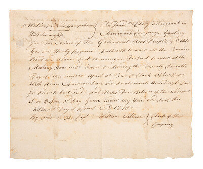 [REVOLUTIONARY WAR]. Warrant summoning soldiers. Hillsborough, New Hampshire, 15 April 1778.