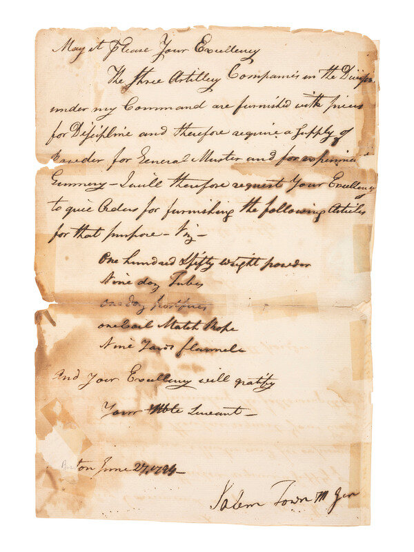 Major General Town requests "a Supply of Powder for General Muster" and other supplies for the artillery companies under his command.